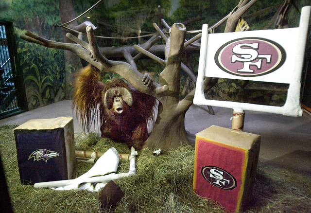 In Salt Lake, Utah at the Hogle Zoo Elijan the Orangutan decides for the 6th times says with knocking down posters with ether the Ravens or the 49ers on a poster. He kept knocking down the Ravens poster, that means he thinks the ravens with win. I think this is important because we think some animals are dum or stupid. If you want to learn more click here.